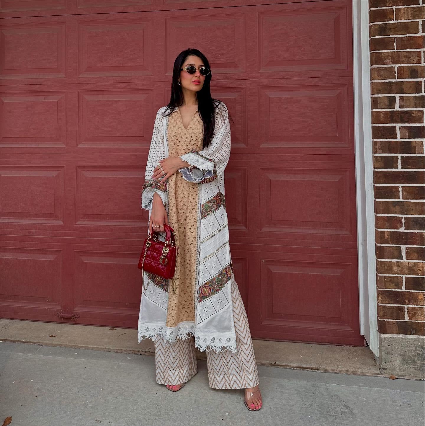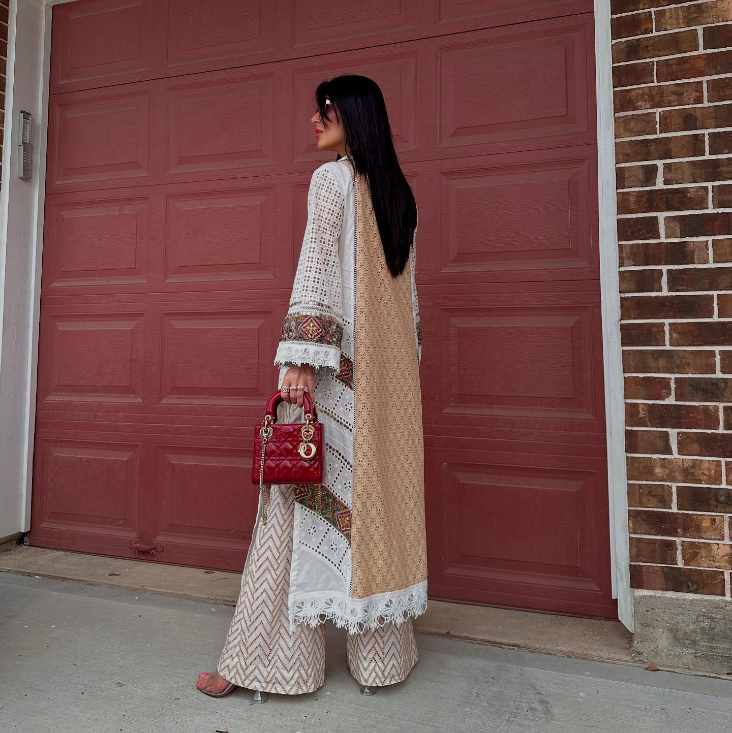 Beige and tan print ensemble, possibly a long kurta or tunic, layered with a stunning long, white, open-front jacket or shrug.