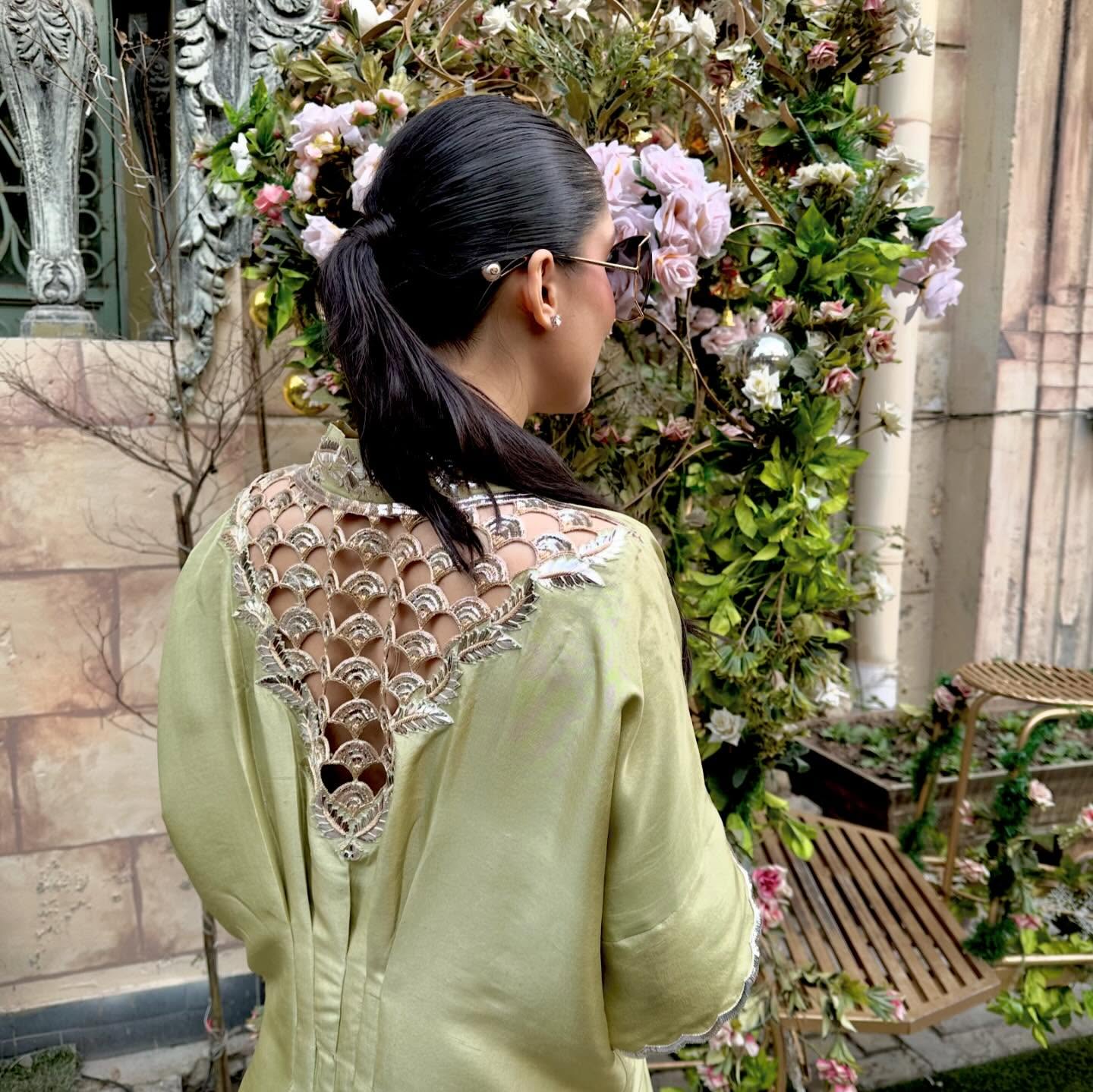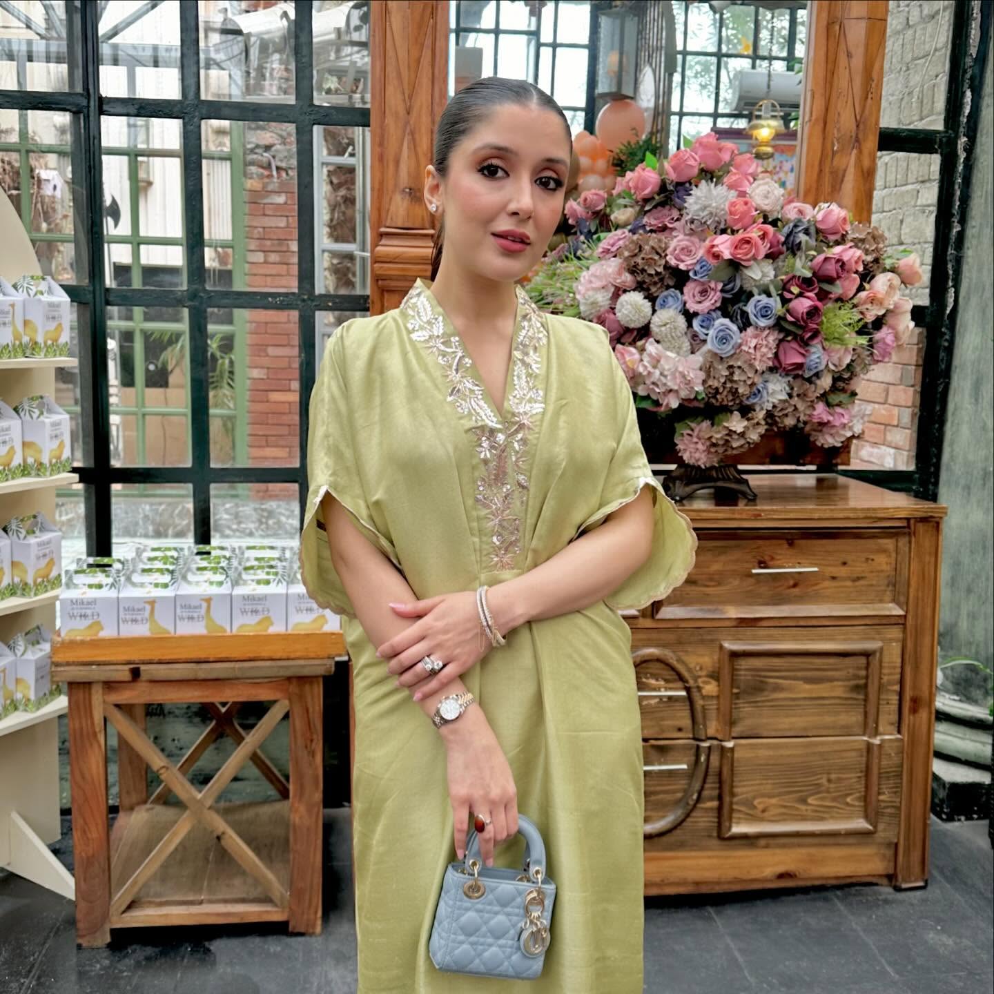 Accessorizing the outfit with several pieces of jewellery, including a watch, rings, and thin bracelets. She is also holding a small, structured light blue handbag that provides a subtle contrast to the green dress. The overall look is effortless and chic, with a focus on comfortable elegance.
