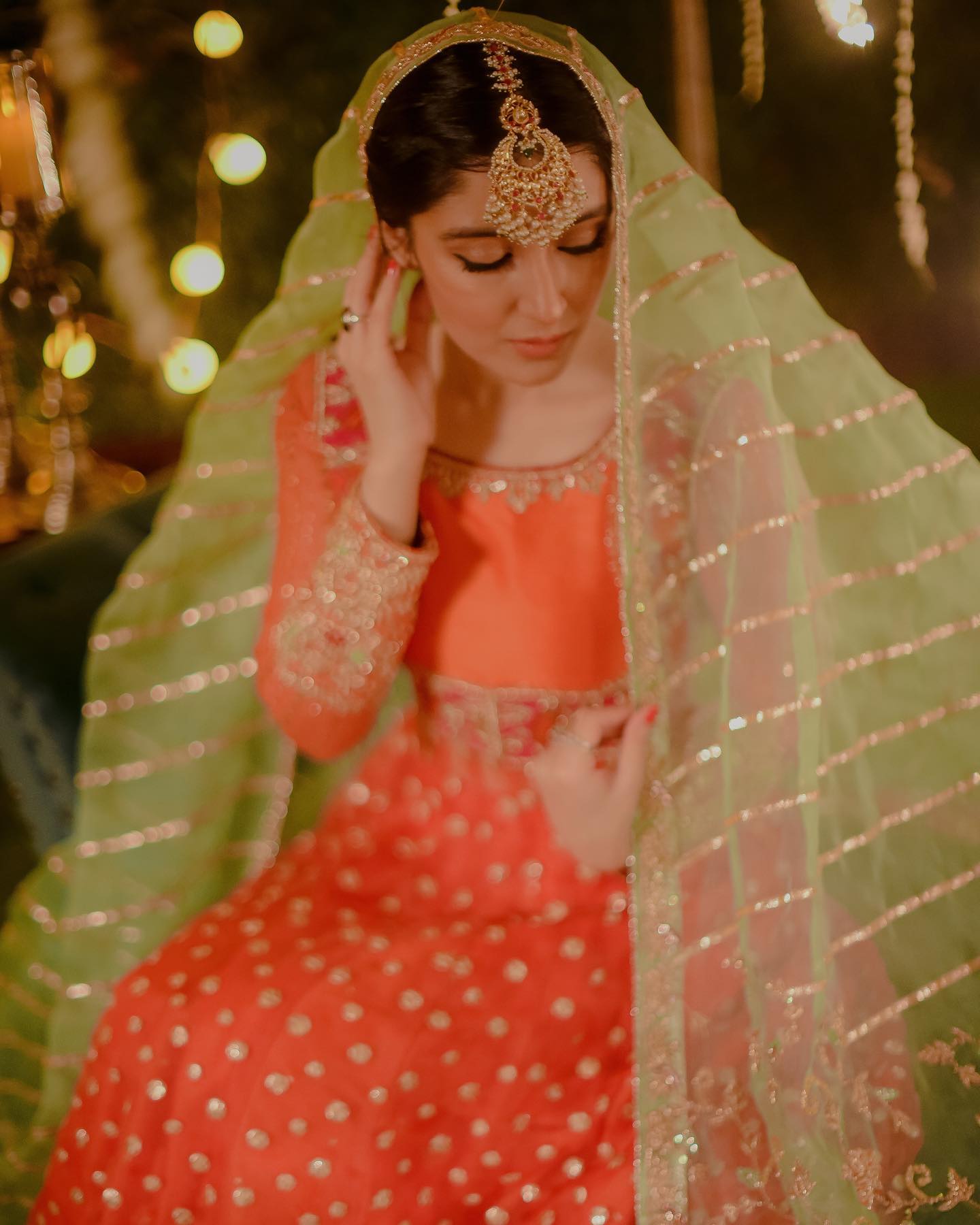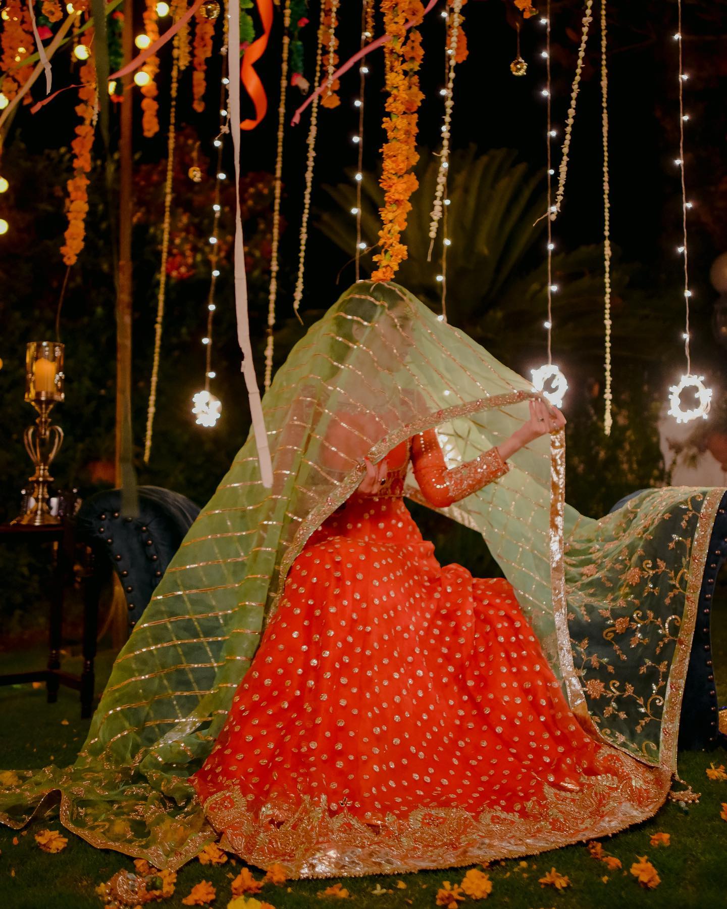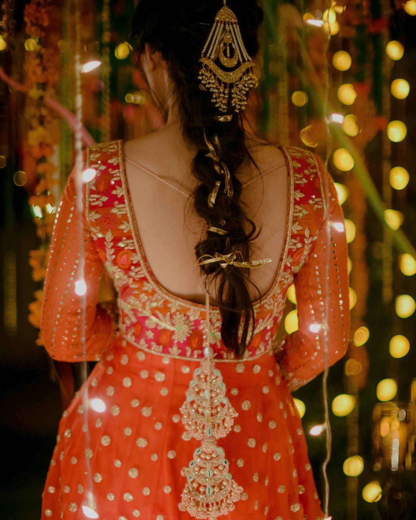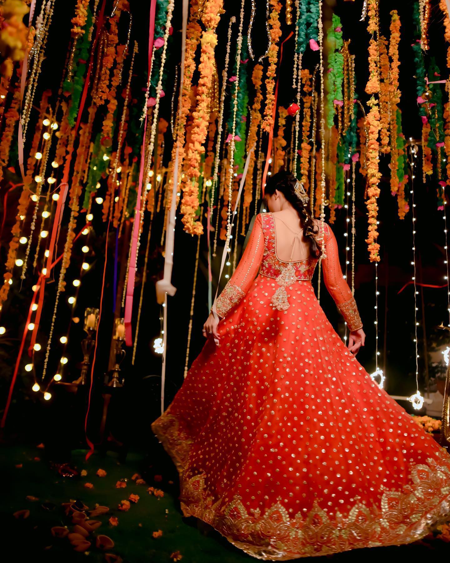 The peshwas is paired with an orange silk lehenga with sitaara chatta, finished with lappa and lace ✨