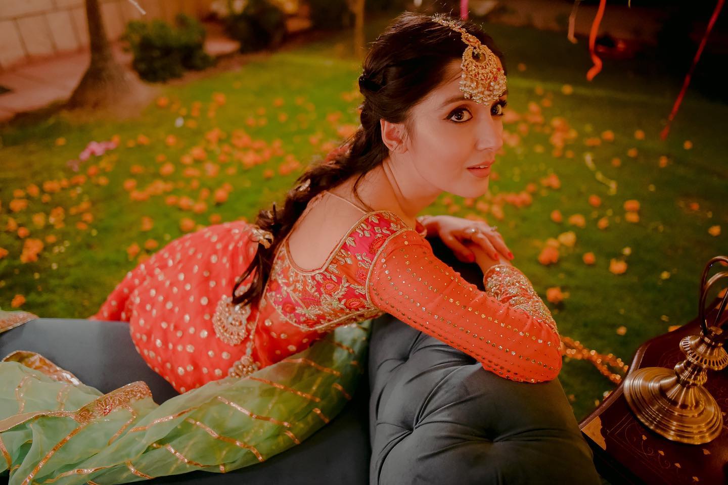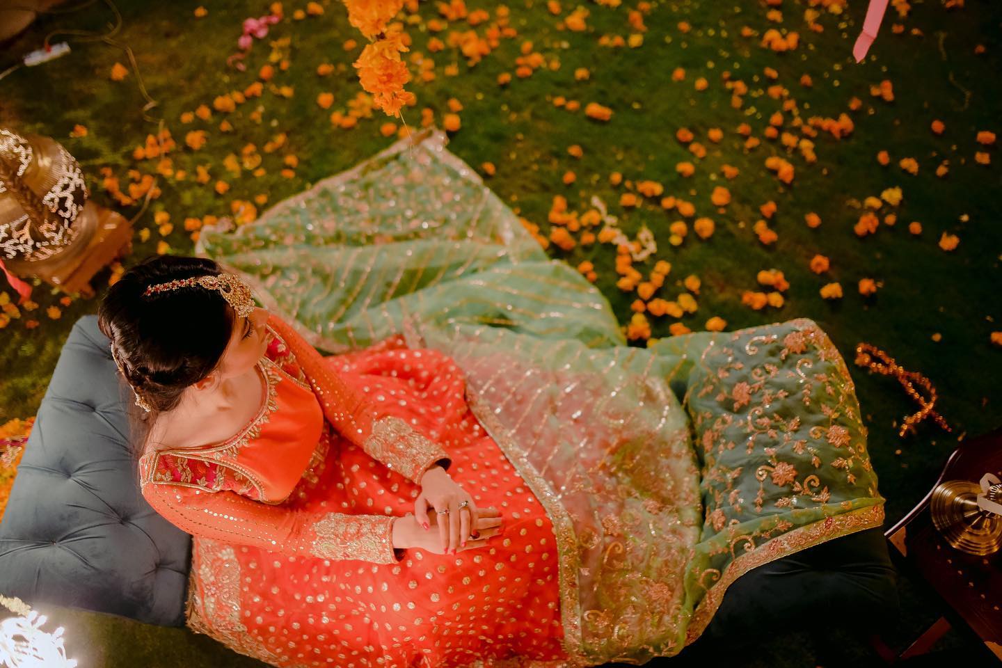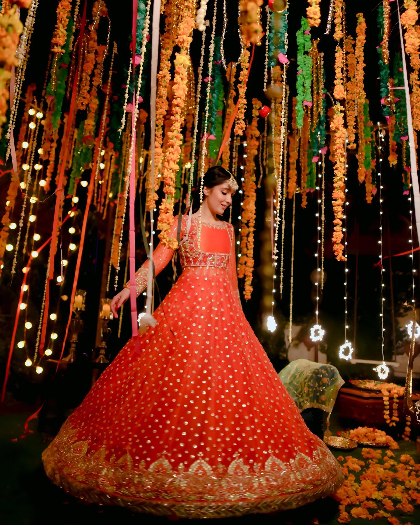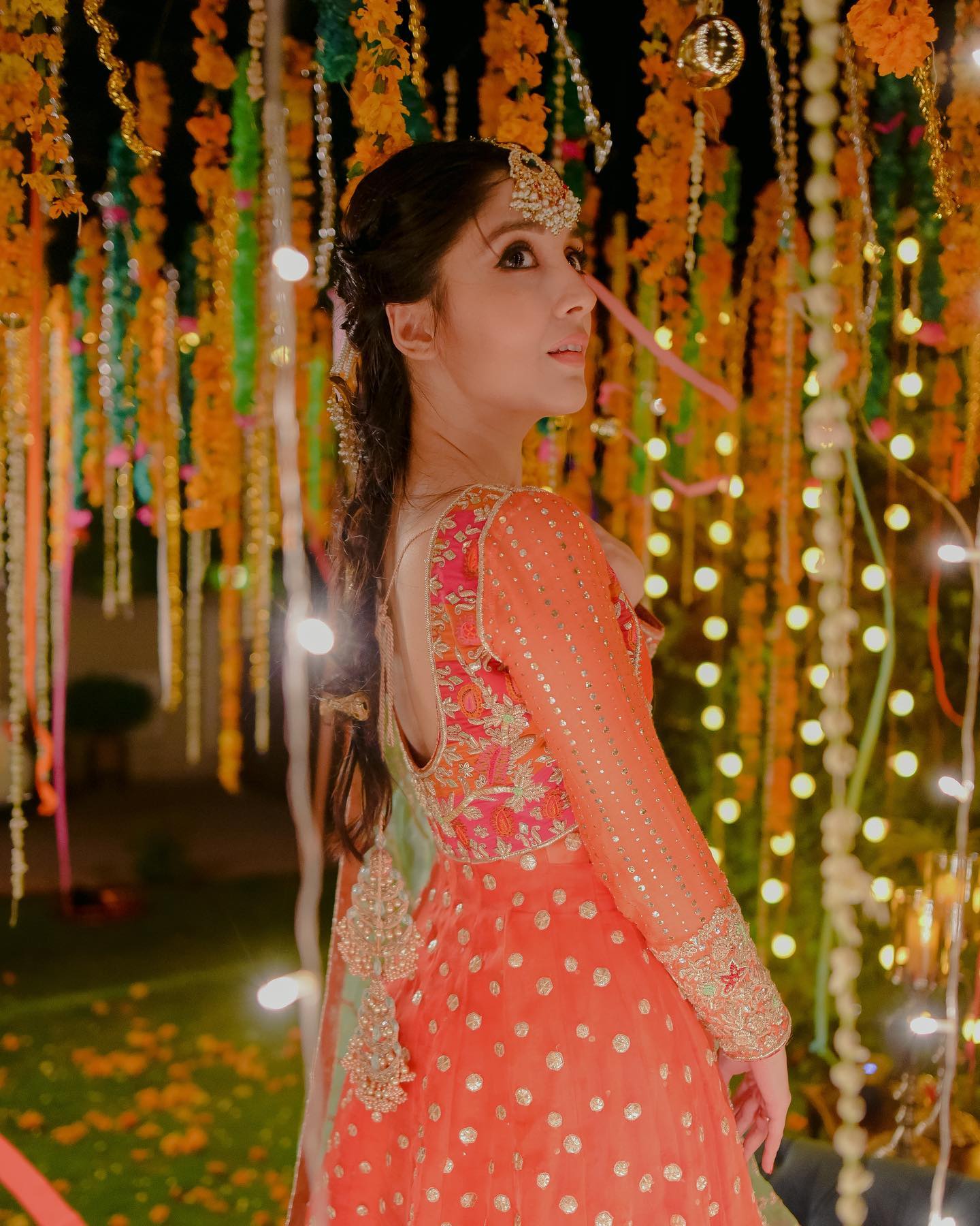 The peshwas is paired with an orange silk lehenga with sitaara chatta, finished with lappa and lace ✨