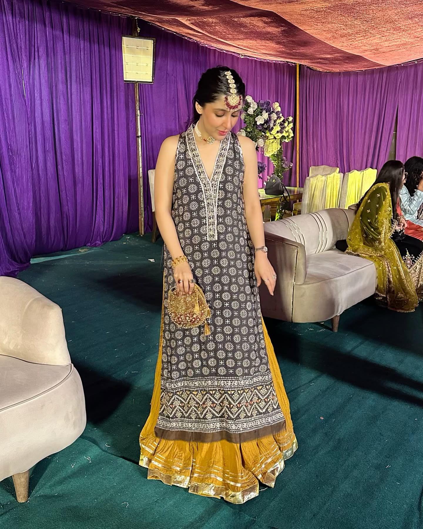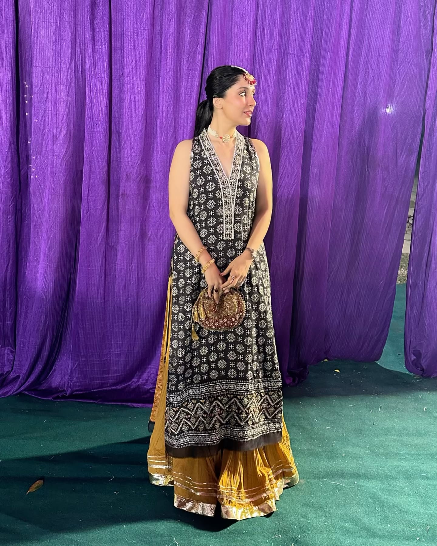 Beneath the black tunic, a flowy, mustard yellow or gold skirt is visible. The hem of this skirt has a detailed gold border with what appears to be a silver or white decorative trim. The entire outfit is a striking combination of dark and light colors.