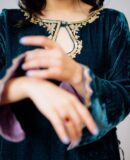Starr – Petrol Blue with Lavender is priced at PKR 48,000. It’s on pure French velvet, paired with a gharchola chunari with hand embellishments. It can either be paired with a black velvet azaar or a crushed silk azaar with gotta lines.